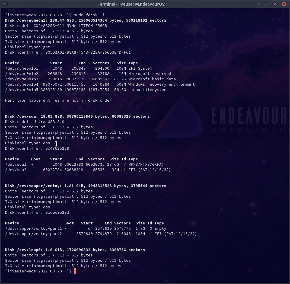 Sau khi đã khởi động vào EndeavourOS Live ISO, mở Terminal và tìm phân vùng cài đặt hệ điều hành và phân vùng EFI System của ổ cứng trong máy