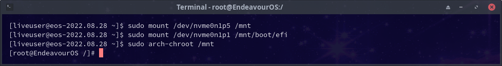 sudo mount /dev/nvme0n1p5sudo mount /dev/nvme0n1p1 /mnt/boot/efiTruy cập vào phân vùng cài đặt EndeavourOS