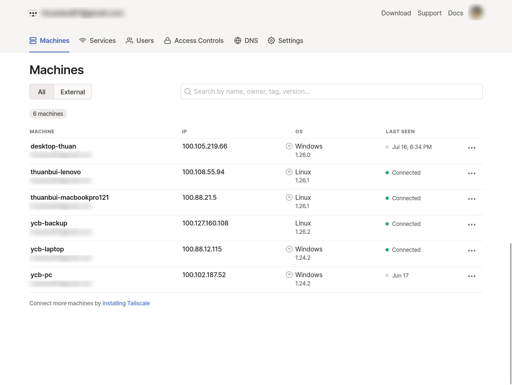 Trong hình trên là tài khoản của mình với các thiết bị đã được cài đặt Tailscale, được cấp địa chỉ IP riêng trong mạng riêng.