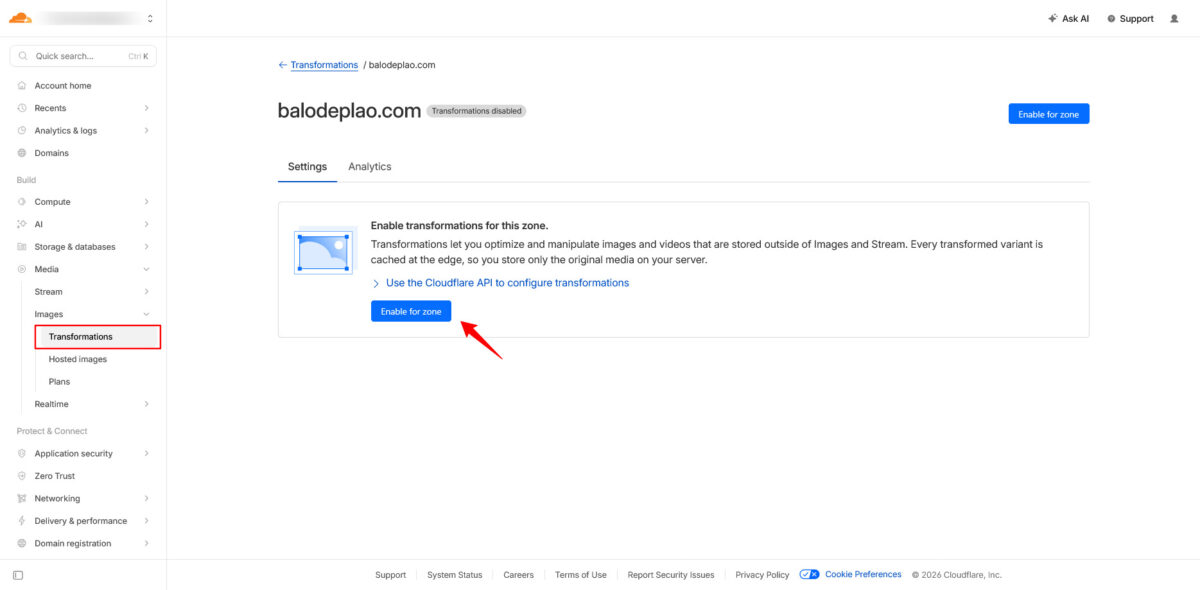 Trước tiên cần kích hoạt tính năng Image Resizing trong Dashboard: Truy cập vào phần Images → Transformation → Chọn tên miền → Enable for Zone