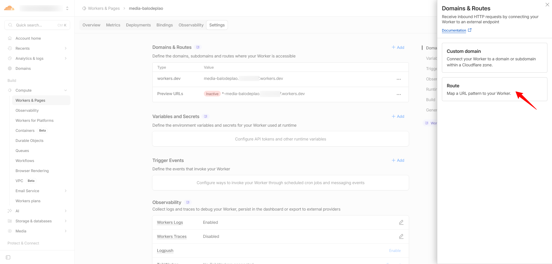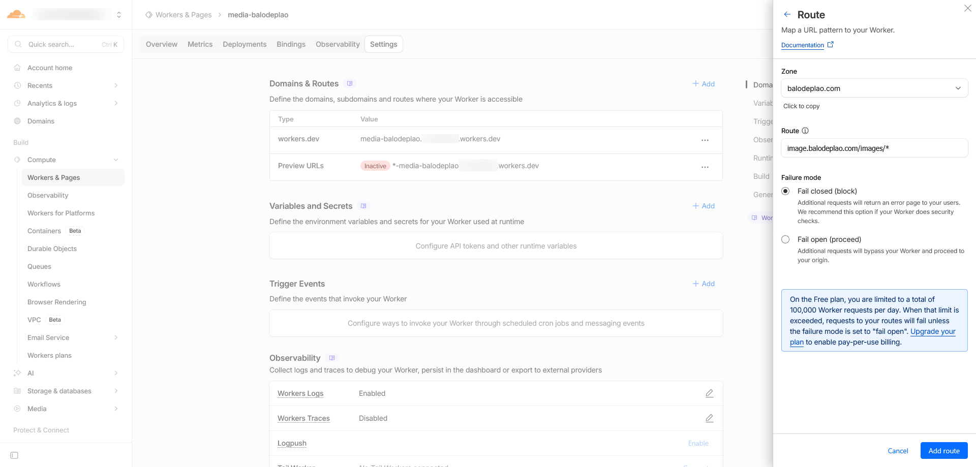 Vào phần Settings của Worker vừa tạo, bấm Add ở mục Domains and Routes, chọn Zone và nhập vào địa chỉ của Cloudflare R2 vào phần Route: ví dụ image.balodeplao.com/images/*, bấm Add Route