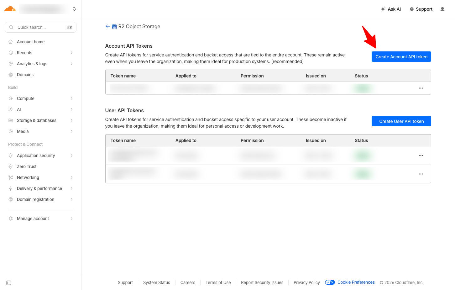 Bấm vào Create Account API Token