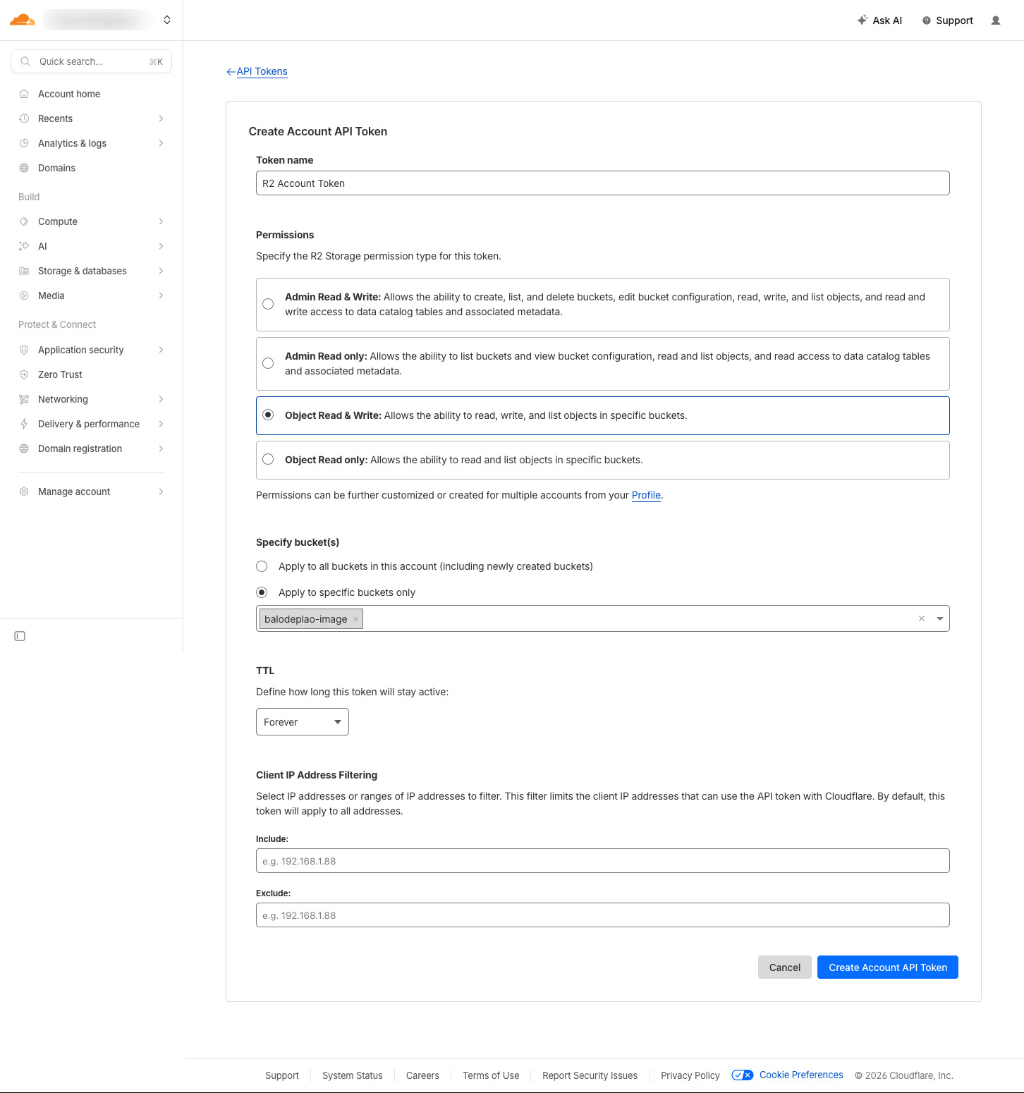 Phần Permissions, chọn Object Read & Write , tiếp theo chọn bucket vừa tạo trong phần Specify bucket, bấm Create Account API Token