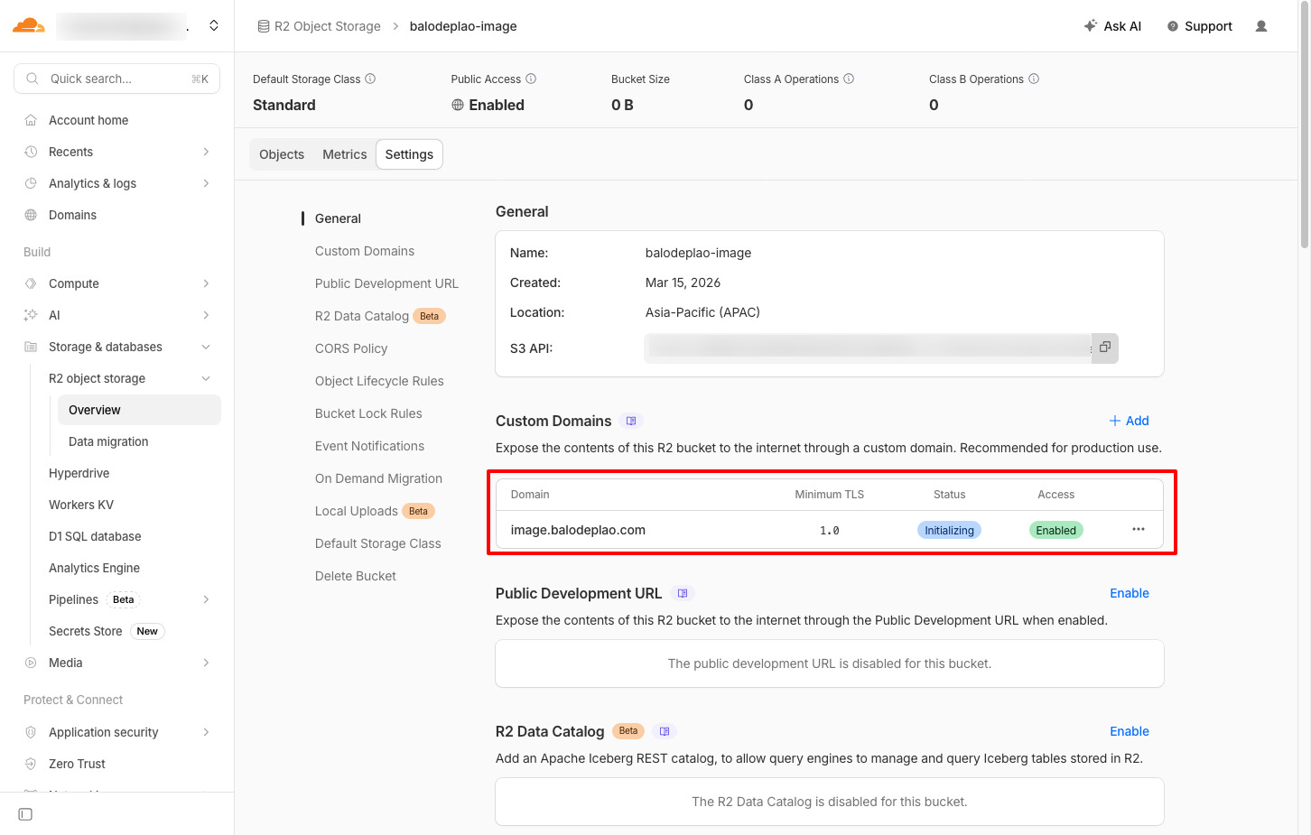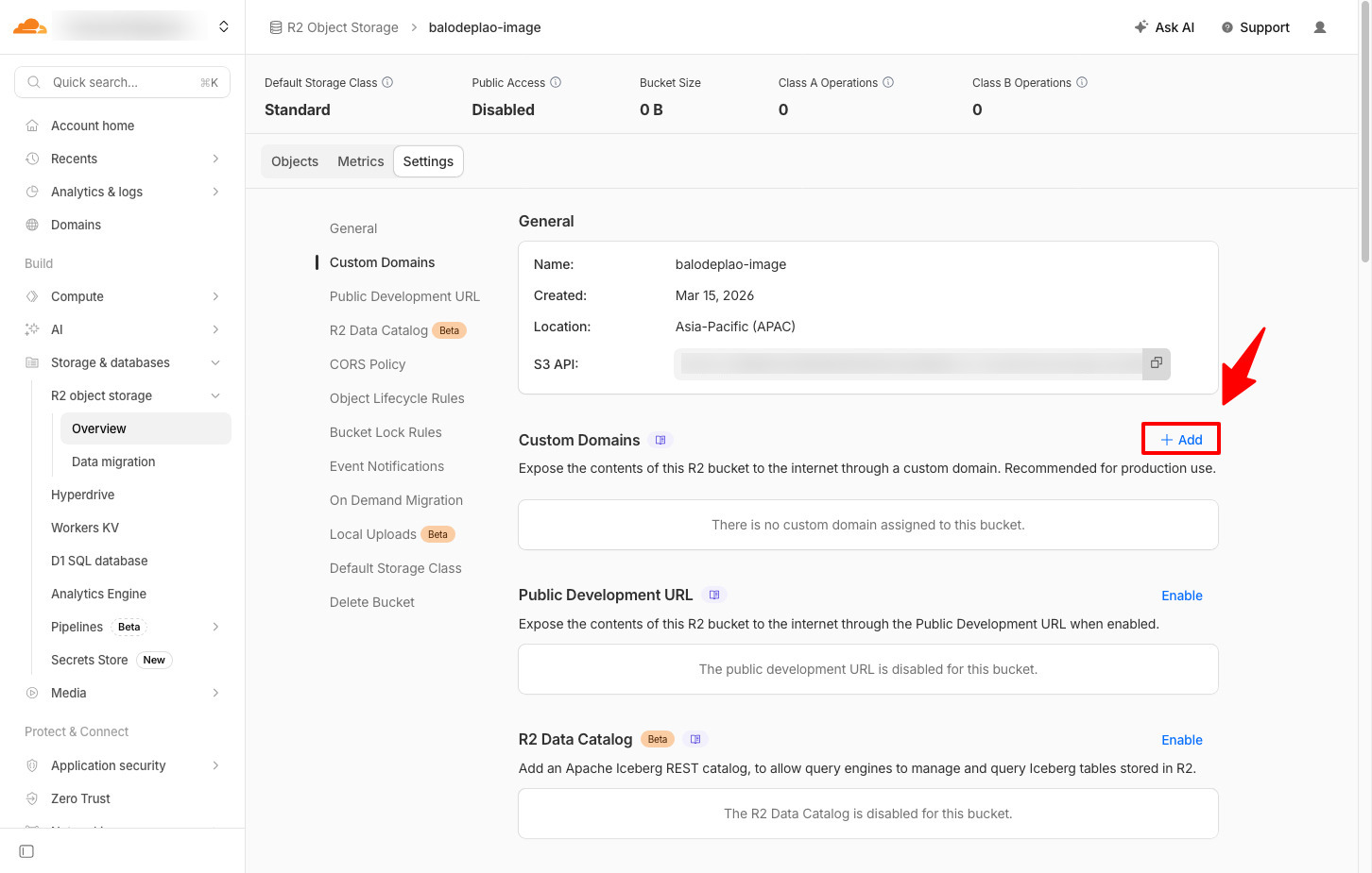 Truy cập vào phần Setting của bucket vừa tạo, tìm đến phần Cusom Domains và bấm Add.