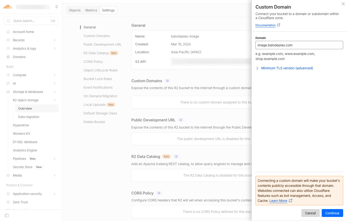 Nhập vào tên miền bạn muốn sử dụng để truy cập vào hình ảnh lưu trữ trên bucket, ví dụ images.balodeplao.com, bấm Continue.
