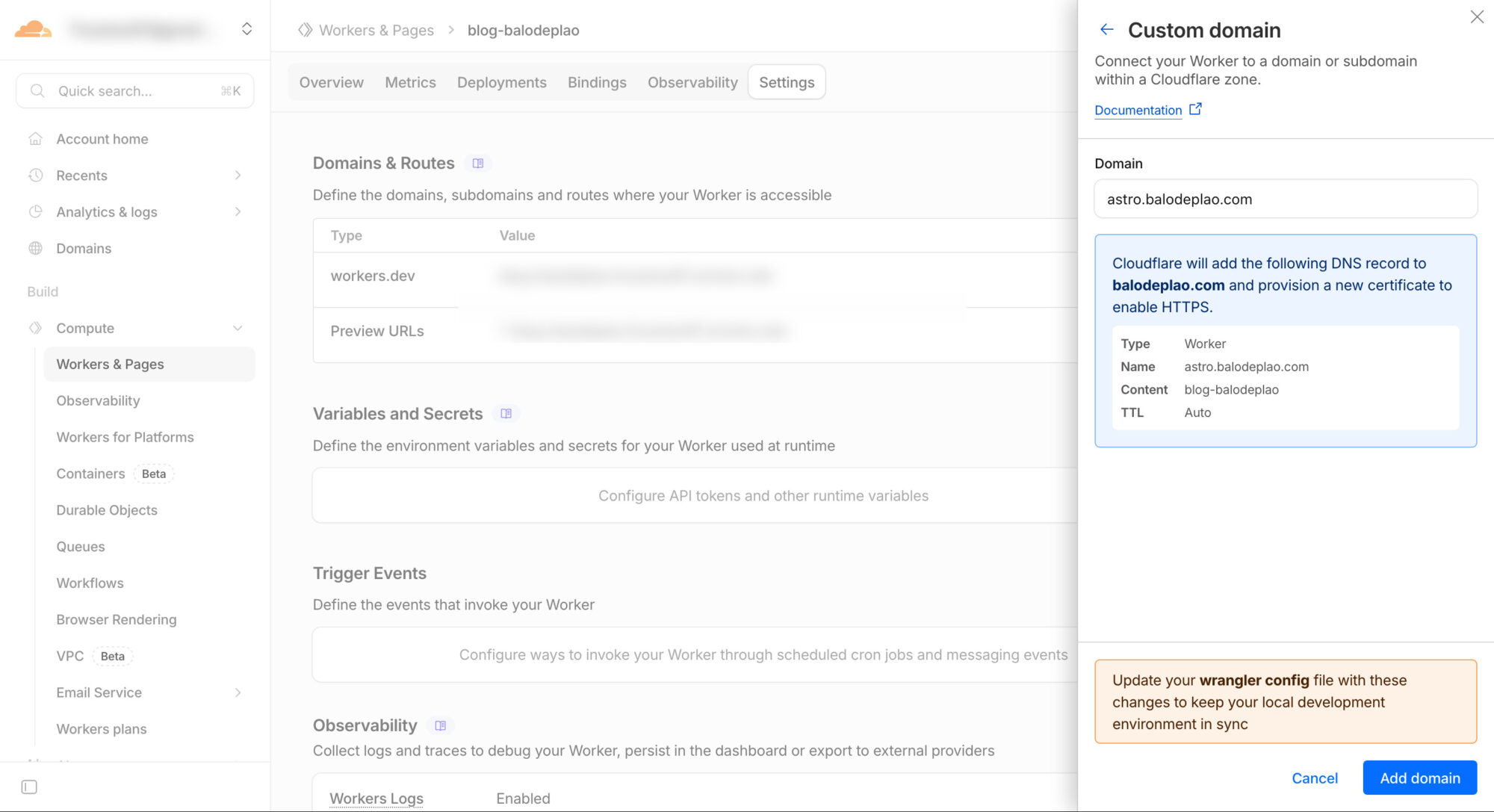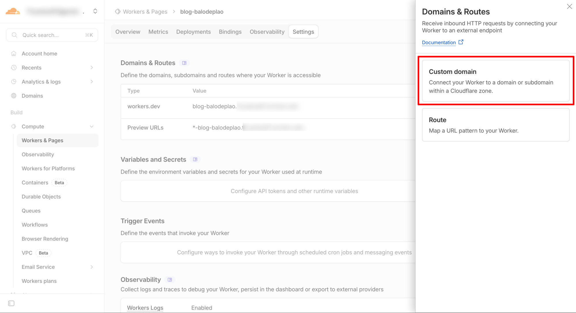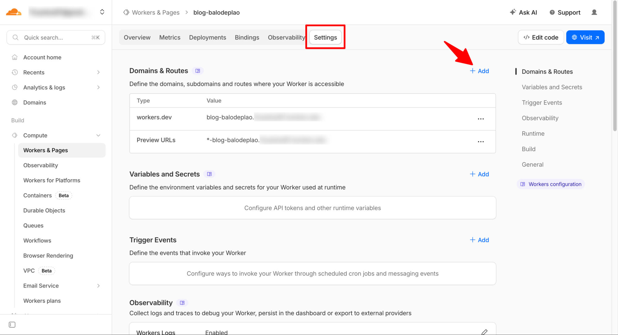 Truy cập vào phần Setting của dự án trên Cloudflare Workers, phần Domain & Routes, bấm nút Add