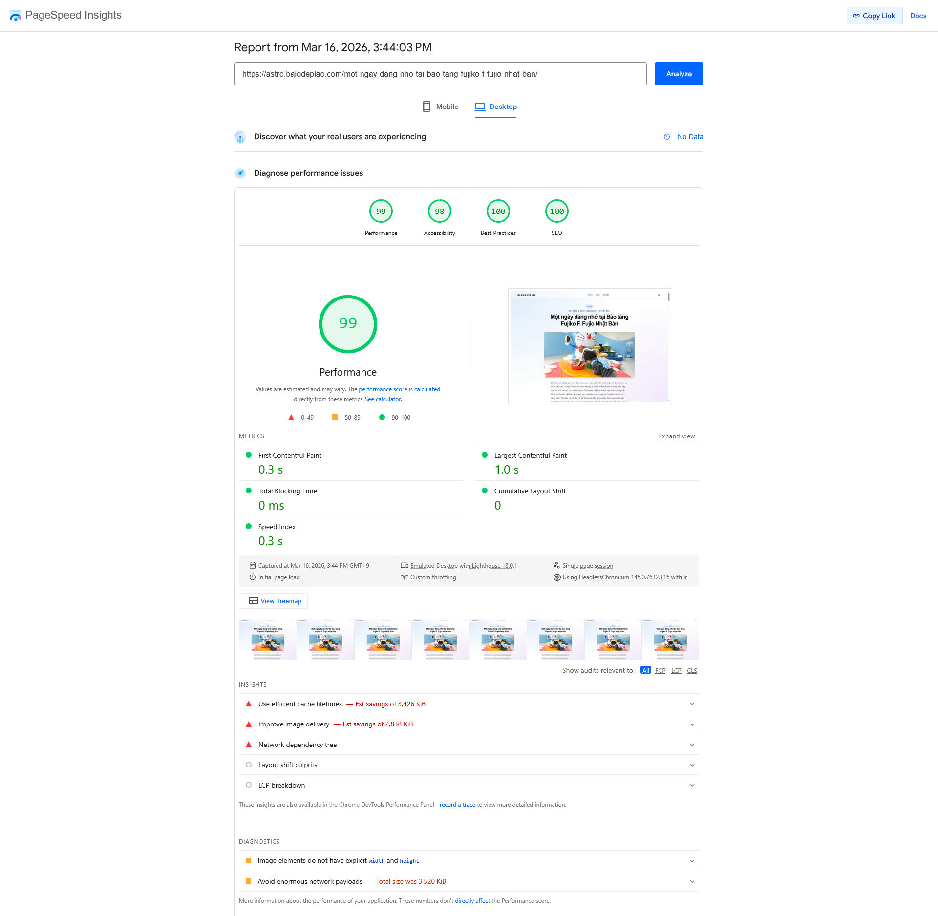 Trang bài viết lần được 100 điểm cho Mobile và 99 điểm cho Desktop, trong khi mình chưa cần phải tối ưu gì thêm.