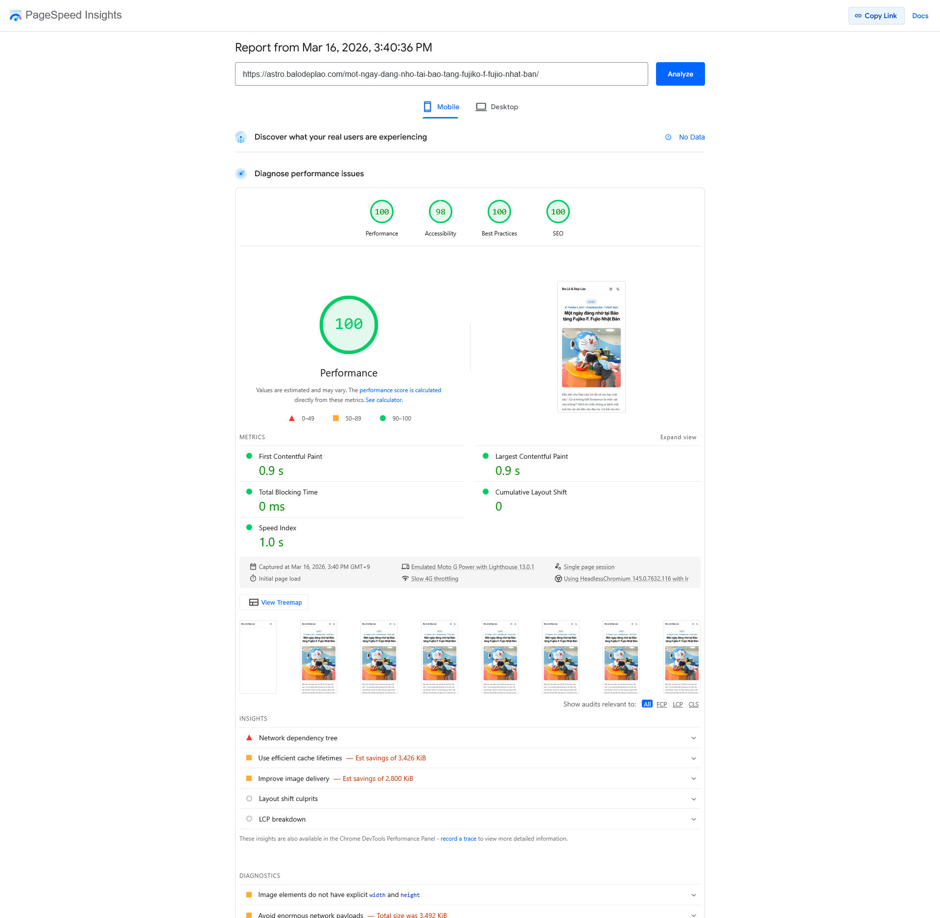 Theo báo cáo từ Pagespeed, mình có thể tối ưu thêm hiệu năng bằng cách thiết lập cache cho hình ảnh, và chuyển đổi jpg/png qua webp. Nhiều khả năng sẽ được điểm tuyệt đối 100 (Mobile) và 100 (Desktop) sau khi làm xong.