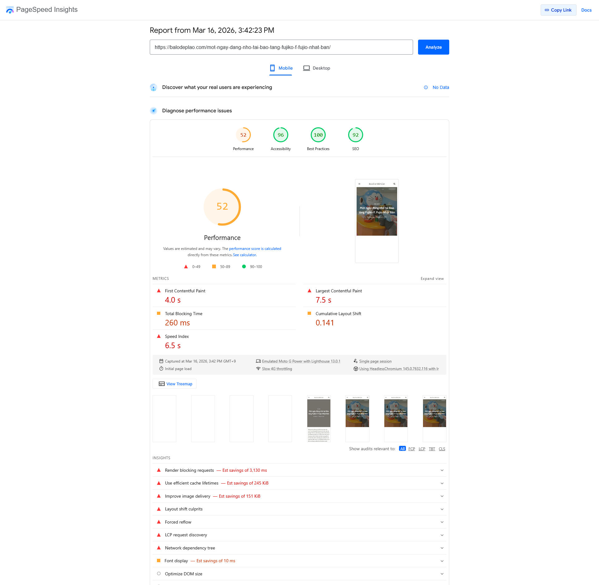 Còn dưới đây là điểm đánh giá của trang blog hiện tại đang dùng WordPress: 52 (Mobile) và 72 (Desktop), đã được tối ưu với Cache Enabler.